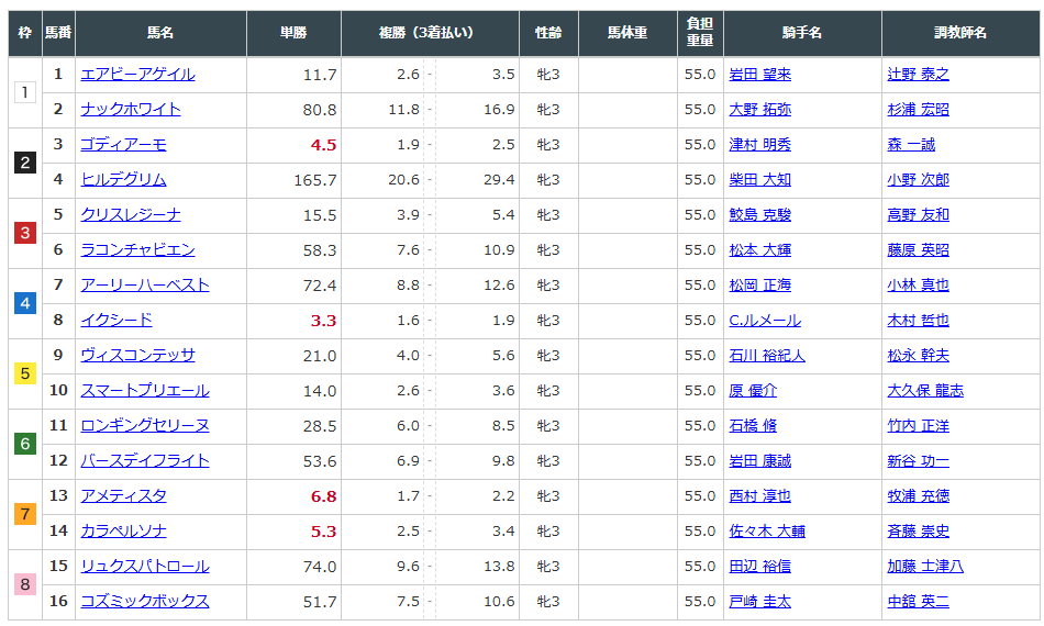 単勝3.3倍、複勝1.6-1.9。