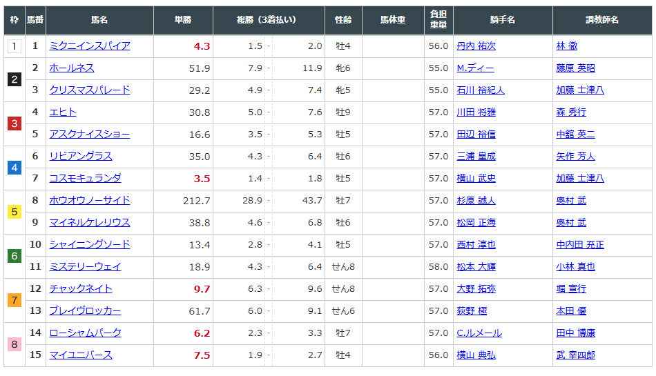 一方で、実績上位のローシャムパーク、中位人気で妙味十分のシャイニングソード、内で立ち回れそうなアスクナイスショーまで差は大きくありません。
